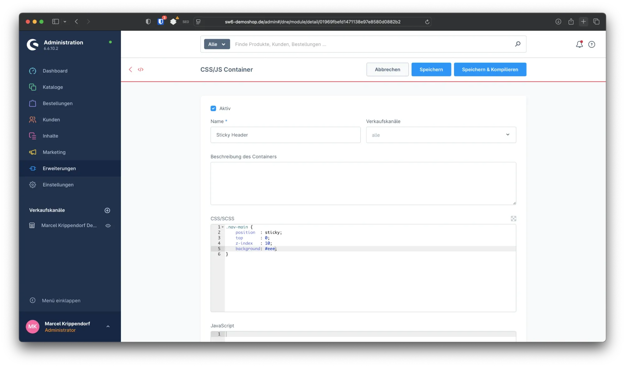 Klicke nun auf Speichern und Kompilieren, damit die Änderungen in deinem Theme hinterlegt werden. Sofort danach kannst Du Deinen Shop im Frontend neu laden und testen: Sobald Du scrollst, bleibt die Navigation nun oben kleben.